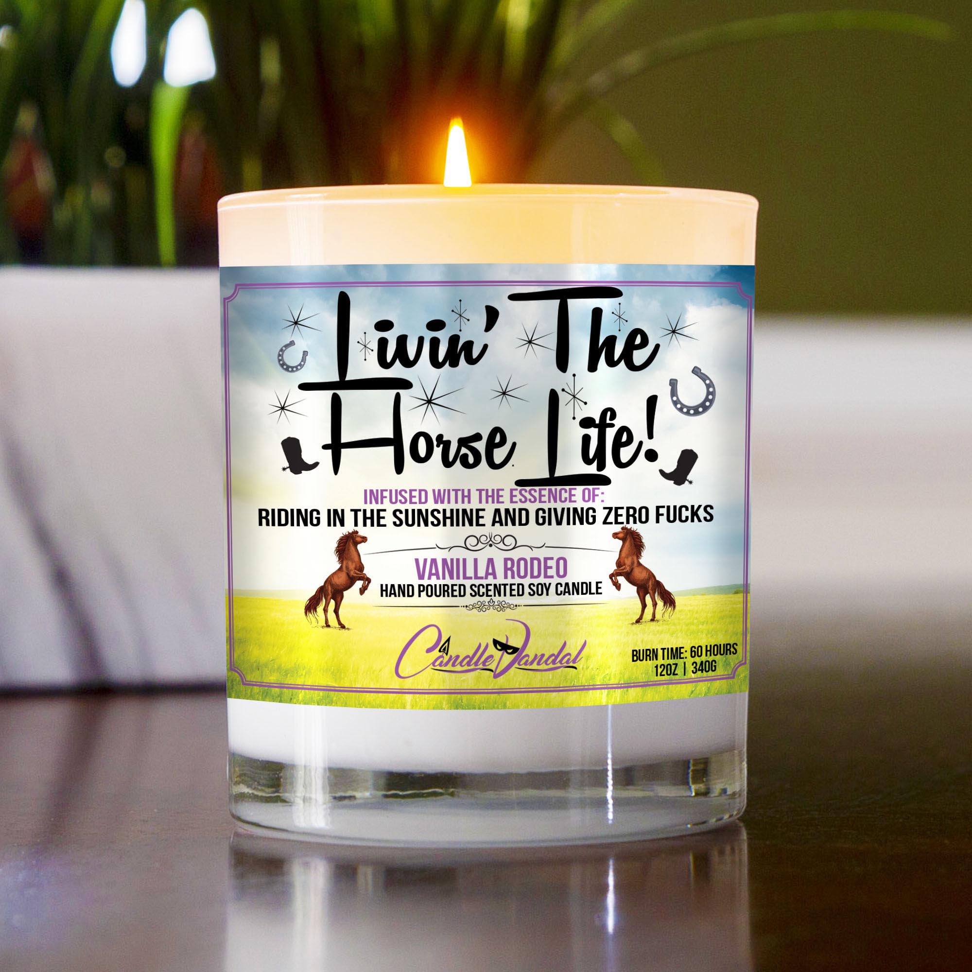 Thank you for checking out this ridiculously fun Livin’ The Horse Life funny horse riding candle. We would love for you to add this amazingly funny candle to your shopping cart and give it a nice home. If you love our candles, please tell every single person you know (and maybe even a few that you don’t) about our awesome candles.